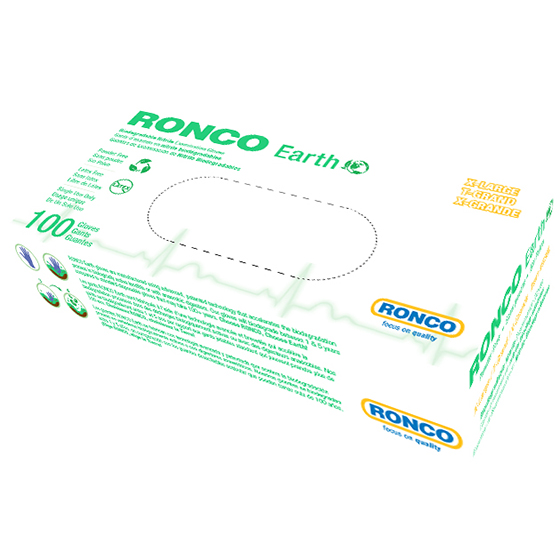 Ronco Earth biodegradable gloves use advanced patented technology to accelerate the biodegradation process in biologically active landfills. These gloves will biodegrade between 1 & 5 years compared to the standard +100 years for regular nitrile gloves. Build a sustainable future with Ronco Earth Biodegradable Gloves. Choose Ronco, Choose Earth!