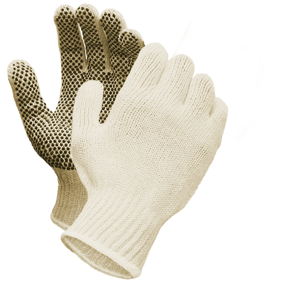 These economical stringknit gloves have PVC dots on one side for good grip in food processing, general labour, assembly line and warehouse applications. Made of a cotton/polyester blend, the gloves are washable for reuse and have colour-coded serging for easy size identification.