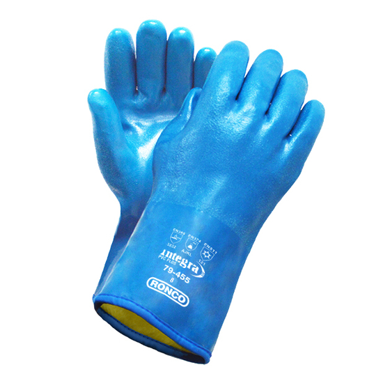 RONCO Integra™ 79-455 is a premium cold and chemical protective glove made from a special blend of polymer materials to enhance performance. This 3rd Generation PVC glove from RONCO is more flexible, soft and hand-forming than standard triple dipped PVC gloves of the same calibre. These gloves provide excellent resistance to oils, fats, solvents and a variety of other chemicals, including acids.