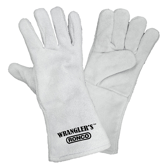 Made from premium quality split leather, this glove is used by workers for welding and general meterial handling. The WRANGLER’S™ gloves offer the ultimate in safety and comfort. Featuring gauntlet cuffs & twaron stitching and jersey lining with cotton canvas cuff lining.